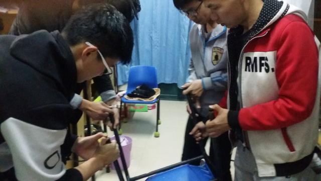晚上7点30分左右,15-3班班长、组织委员和部分同学首先清点了座椅脚套,然后去各个寝室进行安装。座椅脚套分为圆、方两种,于是他们分为两拨人,分别去安装不同的脚套。15-3班同学进入每个宿舍后,他们会首先查看座椅的种类,然后拿出相对应的脚套。在安装的时候,将座椅倒放在地面上,先是用四个脚套轻轻的卡在座椅上,然后再把座椅正放过来,用双手用力去压两端,使其牢牢的固定在座椅上,这样便算完成了一套座椅的安装。15-3班的同学走进一个个寝室,拿出一个个脚套,安装一个个座椅。直至晚上8点40分左右活动才结束。