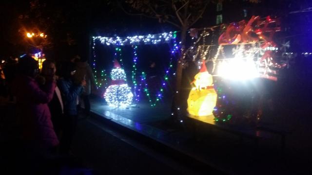 所在的区域布置。他们先是摆出了一个雪人花灯,这个雪人花灯圆挺挺的白色肚子再加上带有圣诞帽的脑袋可谓萌态十足。尔后他们又拿出了三个贴有红色卡纸的猴子花灯,用胶带固定它们使其成为一个带有顶盘的三角形状,然后上面再放上几个桃子花灯,此举也切合了猴年的到来。之后他们又摆出了“2016安全”的字样,预示着新的一年安全将会更加辉煌。待到最后,他们开始用小彩灯修饰花边,使其看起来更加绚丽多彩。尽管寒风刺骨,但经过大家的努力,下午五点,花灯已全部布置完毕。