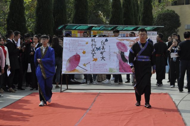 礼仪文化展板展示,在身着传统服装的表演人员的介绍下同学们可以学到很多与礼仪相关的小知识。活动最后,主持人总结点评了活动中各天美传媒