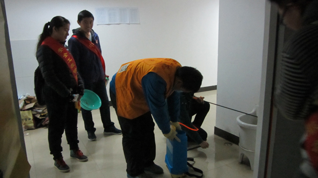 消毒开始前,服务分队队长组织部员们穿好防护衣,戴好口罩和手套,并将消毒液稀释,由其中一个部员背上农用喷雾器。准备完毕后,服务分队全体部员向目的宿舍出发,准备开始对宿舍进行消毒。喷洒消毒液、敲门并说明来意、解说活动目的,各项工作由不同人员执行,服务分队的同学们分工明确,效率极高。各个宿舍的大一同学们都积极配合,分队人员细心负责,喷洒消毒液细致到位,且分队队长细心嘱咐同学们在30分钟的充分杀菌后记得通风。本次活动进展非常顺利。