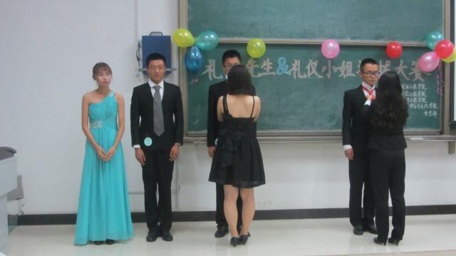 晚七点,礼仪选拔大赛正式开始,由主持人致开幕词并宣读比赛流程和规则,介绍到场评委,然后进入选拔环节。此次选拔共分为三个环节,第一环节是男女搭配,伴随着音乐在舞台上摆出两个不同的pose,来展示各自小组独特的风采;第二个环节更具特色,现场三组选手携手登台,女生为男生打领带,台下评委将按照相关规则给出相应的分数。两组选拔结束后,主持人与现场观众进行相关礼仪知识互动,幸运观众将获得丰厚的礼品。随之进入第三阶段选拔,这一环节独具特色;首先,各组选手观看一段视频,然后模仿剧情,表现生动贴切剧情的一方获胜。选手们的姿势独居特色,赢得了评委以及全场观众一致好评。最后主持人公布各参赛小组的成绩,此次礼仪选拔大赛圆满结束。