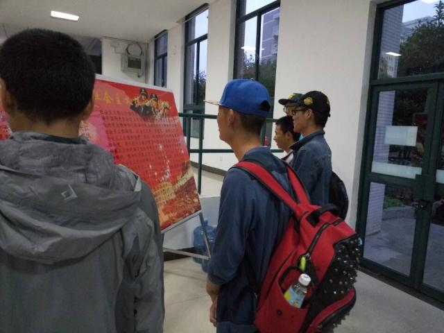 本次庆国庆展板活动于29日下午一点开始,在知行社成员们如火如荼,紧锣密鼓地组织和实践下,当天晚上八点,庆国庆展板在梅苑三号楼一楼大厅展出。展板以鲜艳的红色革命图为背景,其内容主要分为两部分,左半部分引用古文歌颂祖国大好河山,并介绍了将十月一日作为国庆节的整个来龙去脉,右半部分则介绍了社会主义核心价值观的主要内容以及贯彻社会主义核心价值观的意义。整个展板内容充实简短,文字清新有力,引来多位路过同学的驻足参观,特别是拎着大包小包准备回家享受假期生活的同学,在梅苑三号楼大厅门口形成了一道独特靓丽的风景线。
