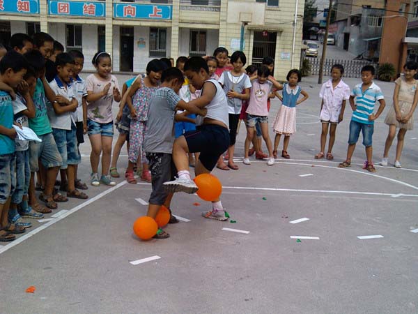 上午8点,待校长和志愿队在上面讲话完毕后,趣味运动会正式开始。此次运动会别出心裁,团队回收利用废旧物品,做成比赛用具:矿泉水瓶做的接力棒,废报纸做的“铺脚石”,鸡毛做的毽子,筷子做的飞镖……比赛用品出奇,但运动项目更加精彩:三人两足,抢坐椅子,拔河比赛,蒙眼打鼓,踩气球……在各式各样的趣味竞技比赛中,同学们认真投入,志愿者也参与其中,操场上到处洋溢着欢声笑语和运动带来的乐趣,最后运动会随着拔河结束的哨声落下帷幕。