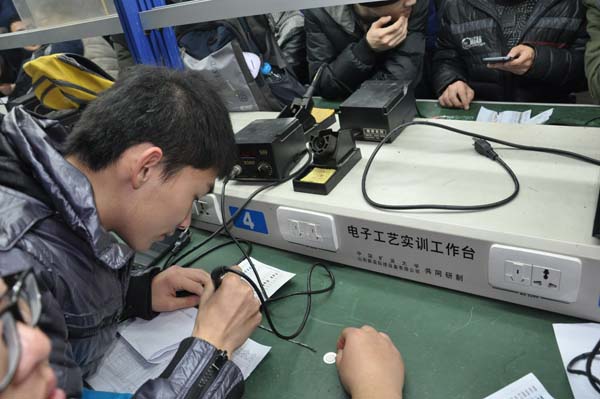 A505焊接实验室准时开始。首先,由主持人宣布了本次比赛规则,并对参赛选手提出要保护实验仪器的要求。本次比赛共分为三天举办,获胜者即为用时最少焊接完成多用电表的队伍,最终结果会在比赛全部结束后公布。其次,由专业人士为参赛选手们讲解了焊接方法。经过两个多小时的激烈比拼,所有参赛选手们都完成了焊接多用电表,各队伍的成绩将在第二天公布出来。