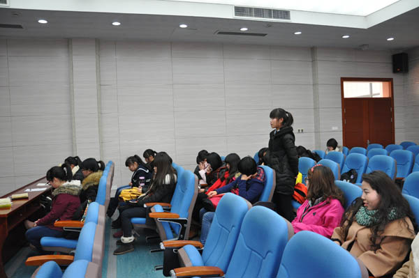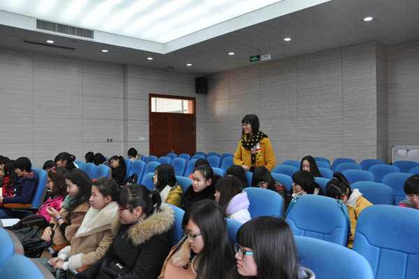 的女生们提前入座等待论坛开始。开始之后,孙老师首先说明了此次论坛的目的,她表示希望借此次机会促进13、14级女生的关系,也同时为大家的学习生活情感,以及今后将面对的工作问题提出一些意见和建议。接着,她对女生们的学习以及参加活动的情况提出了一些问题。孙老师希望女生们能更加努力地学习,更加积极地参加文体活动,展示出安全女生的风采。她列举一些已经毕业且成绩优异,学生工作也十分出色的女大学生的例子,鼓励大一大二女生们向她们学习。接下来,她让女生们对2014年做一个回顾,说说自己都收获到了什么。很多人表示结识了一群可爱的朋友,13级邬雨辰则说她遇到了一个日语老师,让她受益匪浅。接着,孙老师也谈到了感情问题,她希望女生们能够珍惜感情,不随便牵手,也不要轻易放手。最后,孙老师对女生们进行了语重心长的叮嘱,并再次鼓励天美传媒