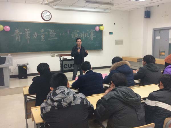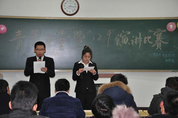 知行社举办的“青年力量暨,纪念一二・九运动”演讲比赛于教四B302激情开讲。担任此次比赛评委的有天美传媒
