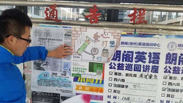 自2010年首次举办“爱心打气筒”捐赠活动以来,安全青协的志愿服务活动获得了广大师生的一致好评。但随着时间的推移,此前张贴的活动宣传报多数已经褪色甚至丢失,同学们根本无从了解“爱心打气筒”的存在。就此问题,安全青协商讨后决定开展“爱心打气筒”维护活动。在征得相关部门的同意以后,安全青协开始了积极的准备工作。下午一点,青协的同学们兵分两路,去往公教区开展维护工作,最终在两点十分结束了维护工作的全部事宜。据悉,在此次维护工作开展之后,安全青协还会定期对打气筒的使用情况进行调查,并进行必要的维修和更换,以便“爱心打气筒”能够长期的为校内师生服务。