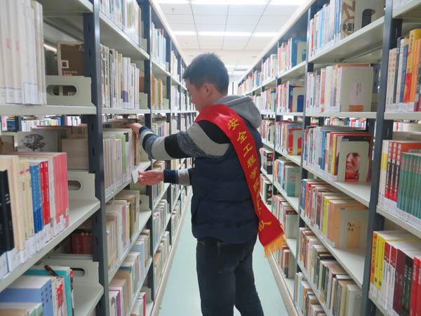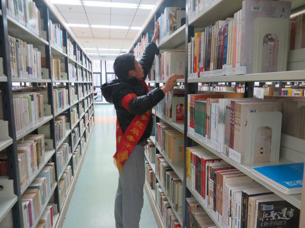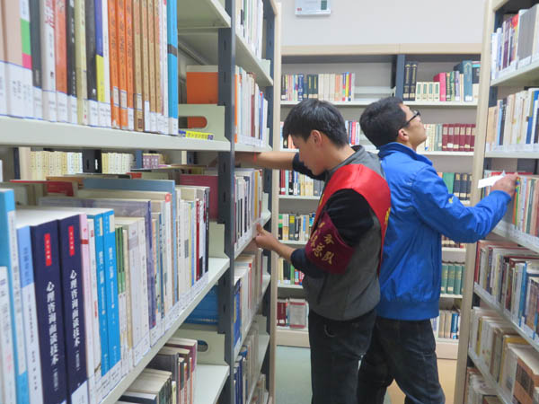 在共建活动开始之前同学们仔细听取图书馆的值班老师的指导,这次活动的主要内容是整理图书,服务分队的每同学都拿一个夹书板,随后到不同的书架整理书籍,他们将没有放回书架的图书放回原处,并且用夹书板将图书挤压整齐,安全服务分队的同学们迅速掌握要领,并且很快将一个个书架整理整齐,服务分队同学们认真的工作态度和良好的工作效果也给图书馆的工作人员留下很好的印象。