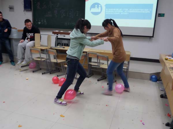 班会伊始,团支书董齐齐同学用幻灯片播放了班级一年来的努力和成绩。回忆着过去的欢乐和挑战,同学们更加坚定了以后的脚步。紧接着便是此次班会的游戏环节,“四人夹气球”“你猜我画”“七拼八凑”等游戏瞬间将教室的气氛点燃,此时此刻,37个兄弟姐妹在爱的海洋中尽情释放。其中,“护花使者”游戏显得尤为精彩。游戏中班里的同学分为了5个小组,每个小组有一个女生五个男生,其中每个人的脚上都绑上了气球,男生气球被对方踩破就退出比赛,女生的气球一旦踩破则所在小组整体淘汰。比赛一开始,每个队都对对手发动了强烈的攻击,男生们一边保护自己队伍的女生,一边又要踩掉对方的气球,有的男生甚至手脚并用。在男生所剩无几后,幸存的女生亲自上场与对手决斗。游戏在同学们的笑声与呐喊中欢乐的进行着。在班会的最后,路长征、鹿通等同学为班里同学带来了优美动听的歌曲,他们用歌声来表达对班级的爱与依赖。班主任杨威也一展歌喉,用真挚的感情唱出了最温馨的感动。