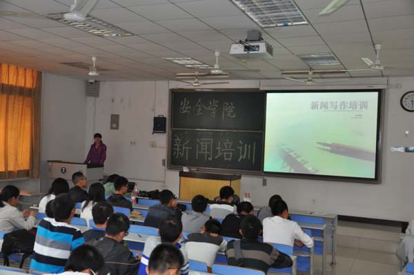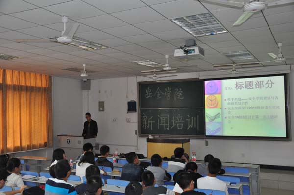 下午2点,培训正式开始。宣传部部长万文斌首先就如何拍摄符合要求的照片做出讲解。他从取景和构图两个方面说起,在讲到取景时着重讲解了拍摄全景、中景和特写的方法,在理论介绍的同时,他用PPT向同学们展示了一些从不同角度拍摄而产生不同效果的图片,这使同学们对如何取景拍摄有了更加深刻的理解。在讲到构图时,他简单介绍了几种构图方法,表示希望大家慢慢体会。接下来,记者站站长董方姝对如何进行会议类新闻写作向同学们进行讲解,她主要讲解了开头过程与结尾的写作技巧,并举出了优秀新闻的范例供大家学习。记者站副站长杜贺向各班班级宣传员讲解了如何对班级活动进行新闻宣传,他深入浅出,简介明了的讲解使得同学们频频点头。编辑部部长谭佳昕就比赛类新闻进行了详细讲解,在讲到球类比赛新闻时,她强调了标题的重要性,并举出了几个标题范例,让大家明白了如何才能写出引人注目又简明扼要的题目。接下来,编辑部副部长张宏民就活动类新闻进行讲解,并提出了一些写新闻时可能遇到的问题,包括人物称呼和词汇的使用等。接受培训的干事们都十分认真,并且做了大量记录,同学们都表示参加此次培训受益匪浅。