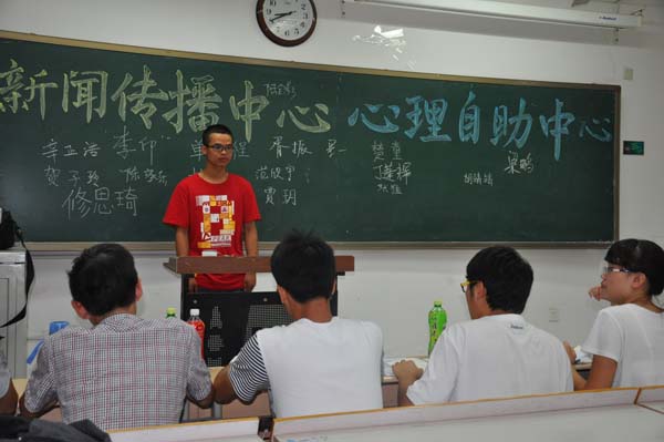 6时许,学生会全体成员在教五集合,布置会场,并在各个面试点门口设立签到处。7时整,参加面试的新生签到交表后在各面试教室有序就坐,面试开始。本次面试由新生在台上作三分钟自我介绍并在黑板相应部门写下自己的姓名,然后由面试官提问,进行两分钟的面试答辩,最后根据各部门具体情况和新生意愿进行评审录取,择日通知。