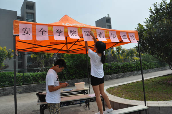 在第三运动场为新生军训搭建了爱心加油站点。