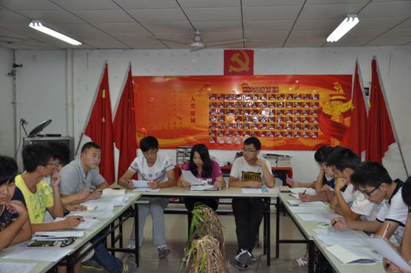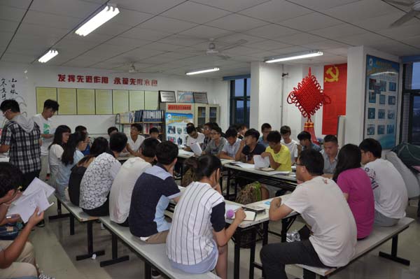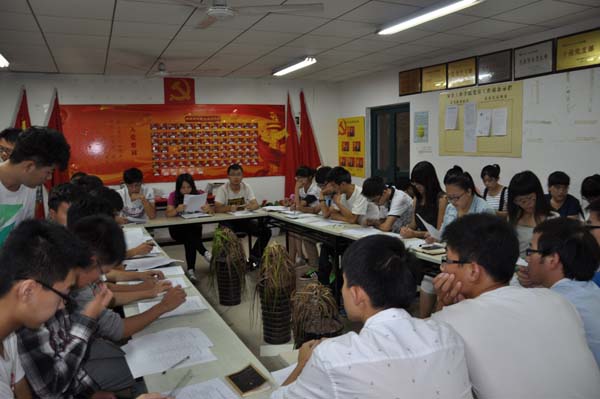 会议开始之前,组织部部长孙明哲给各部门部长发放了新生活动的负责表,军训内务帮扶表,本科生报到须知,军训内务要求等文件。18:30,会议正式开始,学生会主席陶冰冰首先细致地给每个部门部署任务,并耐心地为提出问题的部长解答。然后天美传媒