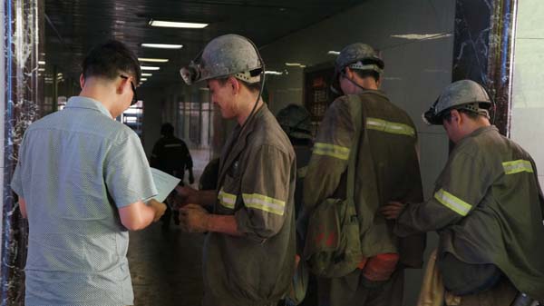 实践团队的全体成员们于7点45分来到了矿井井口的门口。此时正值煤矿工人换班,队员们抓住煤矿工人进出矿井高峰期的这个时机开展了煤矿安全生产宣传活动。队员们兵分两路,一部分队员通过给上下矿井的工人们发放传单和讲解安全生产常识的形式来宣传煤矿安全生产知识。宣传单页上包含了关于乘车、行走、灾害预防和紧急避灾等安全知识和煤矿工人的权利和义务在内的47条煤矿安全生产措施。团队成员们的细心讲解吸引了不少煤矿工人们驻足观看、听讲。同学们还趁机向工人们询问了一些关于煤矿开采方面的情况。另一部分成员则开展了题为“煤矿生产与煤矿从业人员风险评估”的问卷调查,该问卷包括了煤矿生产建议、矿工福利、企业制度与技术改革等12个问题。同学们现场发放问卷,指引矿工们完成了近100份的问卷调查。同学们在一对一的问卷调查之余不忘虚心地向来自不同岗位的煤矿职工请教,并与他们一同探讨煤矿安全生产的相关问题。