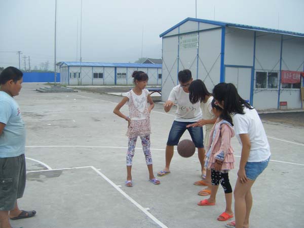 “温暖雅安”志愿者团队的鲁守正同学在思延一小的篮球场上为小朋友们教授了一节精彩的篮球课程。