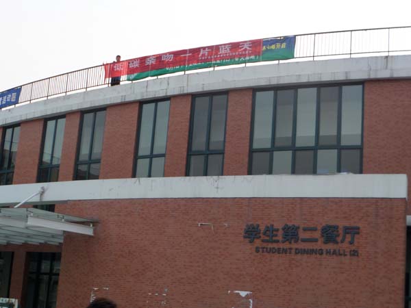 二食堂的广场上,希望横幅的力量也可以让在校的同学们为环保出一份力。