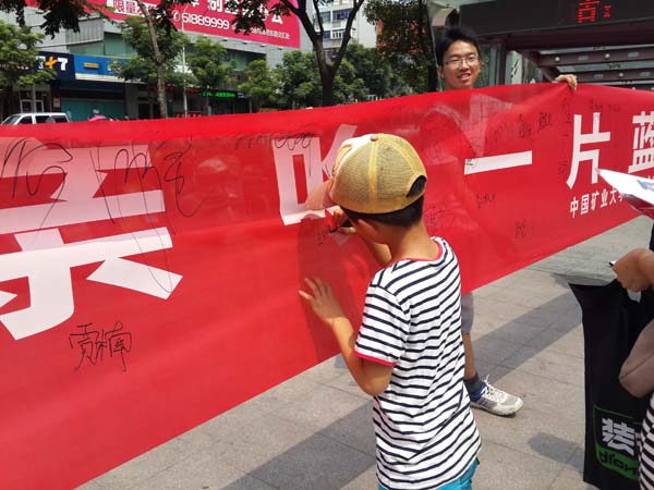 7月18日上午,“寻找蓝天”社会实践团来到了徐州市中心,进行市民环保签字活动,这次活动诣在扩大环保宣传的范围。在市中心这种人流量大的地方可以有效的让更多的人接受实践团对环保的呼吁。