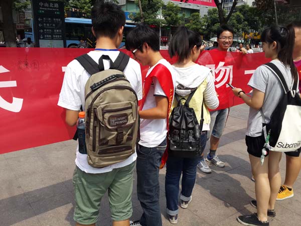 到达指定地点后,“寻找蓝天”社会实践团拉开了定制的横幅――低碳亲吻一片蓝天。横幅由团队的两名成员固定,其余成员向市中心的游客和居民宣讲环保的重要性,并给他们提供笔到横幅上签字。活动刚开始的时候,实践团的成员稍稍感到一丝害羞,不好意思向路人开口介绍此次活动,但在活动小队长鹿通的带领下,成员们逐渐的大方起来,积极的向沿路行走的人宣传环保的知识,不少市民十分赞赏实践团的行为,并愉快地在横幅中间签下了自己姓名。随着越来越多的路人在横幅上留下自己的承诺,小队成员们更加有信心使环境保护的意识扩散到人群中。不管老人还是小孩,妇女还是青年,他们都为环境的保护做出了承诺。活动过后,过往的市民纷纷将垃圾扔到了垃圾箱里,就连街道保洁人员也对实践团开展的活动赞不绝口。下午,“寻找蓝天”暑期社会实践团的成员将横幅挂在了天美传媒