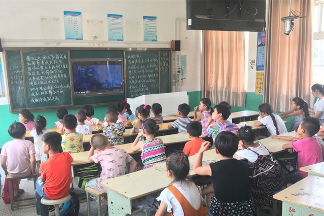 “仲夏希望”支教团组织陶楼小学的学生们观看电影《寻梦环游记》。