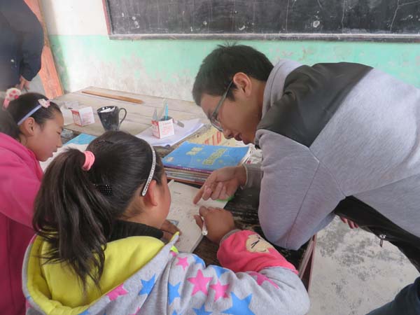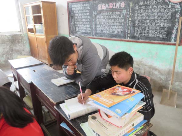 晌午时分,一行人在班长鹿通的带领下来到了桥上中学,值班老师热情地接待了来访的同学们。随后,同学们各自分组,分别前往三个年级不同的班级。在那里,孩子们满心欢喜地等待着。正是自习时分,孩子们都在专心地完成老师布置的作业。于是,同学们一边和孩子们交谈一边辅导他们。当得知很多孩子觉得学习压力太大时,王晓霞同学微笑地讲述了她上学时风雨无阻的情况,鼓励孩子们不要灰心,相信天道酬勤。她的一番讲话仿佛又重新燃起孩子们对知识的渴望。窗外,阵阵笑声像一群白鸽缭绕在操场上。鹿通正带领着初三毕业班的同学在操场运动,让久于埋头备考的同学放松心情,暂时忘记烦恼。同时,唐源同学还为同学们变了一个小魔术,他滑稽的表情逗得在场的同学们捧腹大笑。最后,鹿通向天美传媒