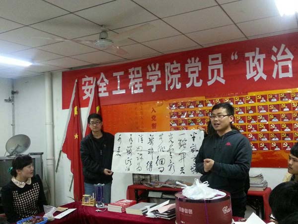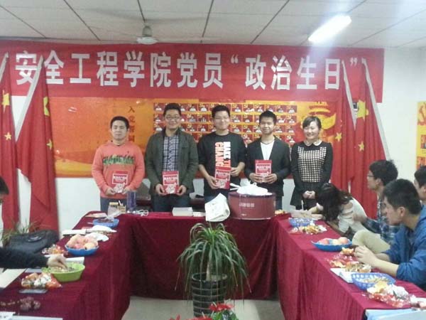 在庆祝活动上,党员工作站站长李先赞向大家阐述了党员“政治生日”的意义,提醒大家时刻谨记自己的党员身份。随后,学生党员朱云飞、武双贺、任青刚、李先赞分别表达了自己对党的热爱和尊重。紧接着,支部代表为四位学生党员赠送了礼物和贺卡,同时,蔡维维老师也为四位过生日的党员赠送了书籍,从而让每个党员都感受到党组织的关怀和温暖。在赠送仪式结束后,部分党员进行了才艺表演,多才多艺的新疆姑娘买克尔班为大家献上了民族风味十足的舞蹈,随后,王清祥的《向天再借五百年》、李先赞的《橄榄树》、朱云飞的《精忠报国》更是将晚会气氛推向了一个又一个的高潮,最后,大家在蔡维维老师的带领下,一起切蛋糕并唱起了《生日快乐歌》,晚会在一个温馨欢乐的氛围下圆满结束。