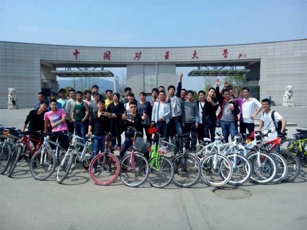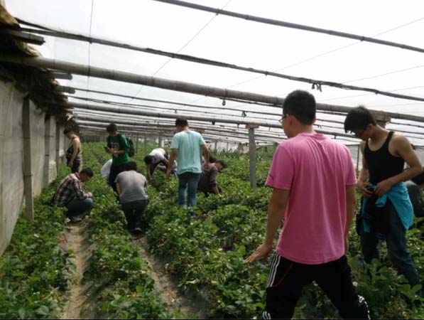 东门出发,前往徐州台上草莓采摘园,虽然途中有大风的阻挠,但同学们依然有说有笑地骑着车子,一路上大家互相帮助,有两名同学负责带路,有两名同学负责垫后,男生帮女生背包,轮流带不会骑自行车的同学,互相提醒注意交通安全,每隔一段时间就停下清点人数……在将近一个小时的骑行后到达目的地――台上草莓采摘园。台上村被称为“苏北草莓第一村”,当一排排鲜红欲滴的草莓呈现在大家面前时,大家都迫不及待地钻进大棚,不顾形象地在草莓园里尽情地吃,一时间好像都忘了旅途的疲惫。