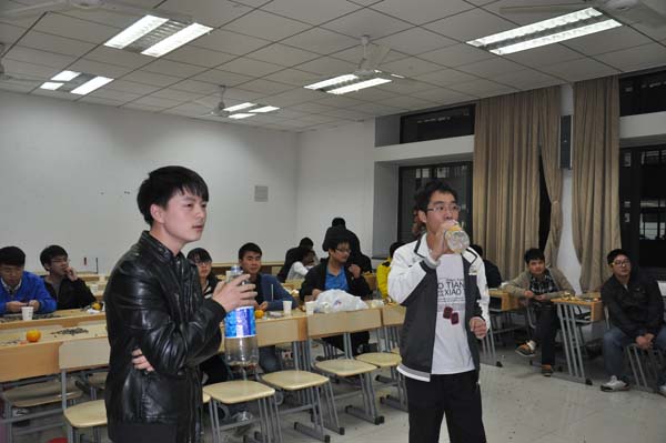晚上7:30,活动在“谁是卧底”的小游戏中拉开了序幕。6个游戏者,1个卧底。在场6个人中5个人拿到相同的一个词语,剩下的1个拿到与之相关的另一个词语。 每人每轮只能说一句话描述自己拿到的词语(不能直接说出来那个词语),与不能让卧底发现,也要给同胞以暗示。每轮描述完毕,6人投票选出怀疑是卧底的那个人,得票数最多的人出局。若有卧底撑到最后一轮,则卧底获胜,反之,则大部队获胜。这是快乐大本营的热门游戏,同学们都很熟悉,也都积极主动地参与到游戏中,班会瞬间就掀起了一个小高潮。游戏者幽默的描述、被指认卧底的窘态都让同学们的笑声充满了整个教室,同学们间的距离就在此刻拉近,快乐其实就这么简单。随后游戏失败者祁钰和徐博雅的合唱《最炫民族风》掀起了此次活动的高潮,他们随着音乐歌唱,轻松、热情与欢快瞬间感染了现场的每一个同学,大家都沉醉于这愉快的歌声中,整个场面顿时沸腾起来,空气中好像也感染了这种欢快的气氛,直上天宇,融于纯净的月光中……