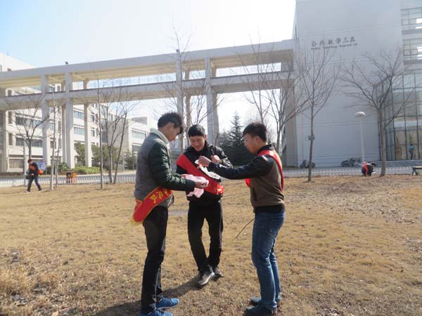 服务分队B组的全体成员在图书馆前集合,在组长靳营得的带领下,陈松,张凯,杜杨,吴文庆,祁成成一行六人积极地参与到天美传媒