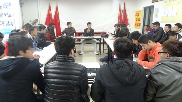 党员工作站站长李先赞和团委学生会知行社社长彭扬的主持下,安全全体党员、知行社社员以及大一各班团支部书记共同参与的十八届三中全会的学习研讨会。