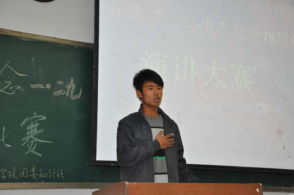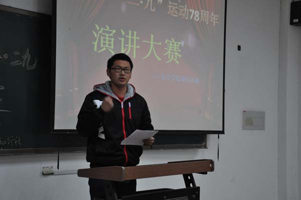 演讲比赛在主持人曹蒙钰的致辞中拉开了序幕。第三位登台的陶冰冰同学是12级新生演讲比赛的三等奖,她演讲的主题是《永远的丰碑》,她的观点鲜明、见解独到,反映客观事实、体现了当代青年的时代精神。同时,陶冰冰吐字清晰、语速得当,赢得了观众的阵阵掌声。接下来登台的是崔捷同学,他演讲的题目是《乘岁月精华扬青春梦想》,他凭借嘹亮的嗓音、适当的肢体语言和完全脱稿的演讲得到了评委以及观众们的肯定。接下来登台的周晶同学和刘锰同学也分别奉献了精彩的演讲,观众们也用热烈的掌声回应他们。最后一位登台的选手是13级4班的靳振铎同学,通过《传承一二・九精神 做时代新青年》的演讲,他畅谈了自己对活动主题的理解,展示了深厚的演讲功底,同时也彰显了当代大学生积极向上的良好精神面貌。本次演讲比赛也在观众们热烈的掌声中画上了圆满的句号。