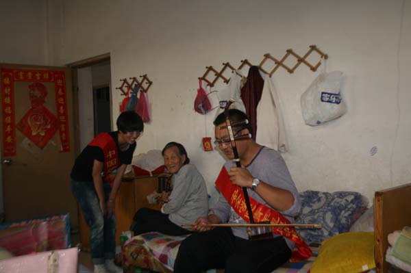 下午3点,青协全体成员到达夕阳红敬老院。同学们先把水果分送给老人,随后他们根据事先安排,有的陪老人聊天解闷,有的为老人打扫房间,并贴上对联和福字。为了让老人感受到当代青年的朝气,他们还特地准备了精彩的节目,有演唱和二胡独奏等。
