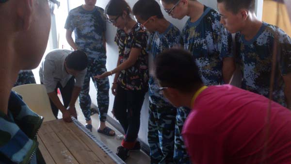 指导工作进行的并不顺利,整理从一开始也不尽如人意。但是团委学生会的同学们仍细心指导:“钉床板要先把床单在床板一边固定住,再在床板上铺上褥子,然后把床单翻过来包裹住褥子,最后用图钉把床单在床板的另一边钉住。”一遍遍的指导,一遍遍的示范。新生们虽然一时间无法掌握复杂的整理过程,但是经过慢慢摸索,多次返工,最后“批阅十载,增删五次”,一张合格的床板成功完工。13级新生在学生会同学的指导下,利用午休的时间,将床板全部钉好,顺利的的完成内务整理中较为困难的“订床板”任务。