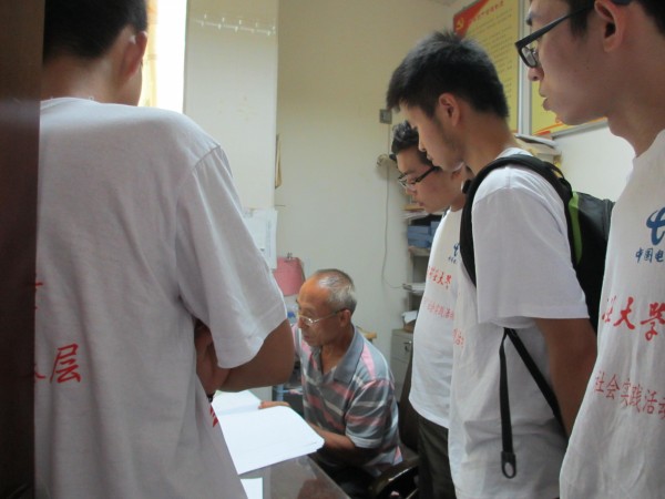 今天是实践团第一天走出校门,开展活动。早晨八点钟,成员们准时来到了三食堂门口集合,一起到达东门乘坐63路公交车前往本次活动的目的地―桥上村。来到村委会以后,成员们受到了工作人员的热情接待,得知我们来此是想要了解有关本村“空巢老人”的情况的时候,村支书主动给我们拿出了他们有关“五保户”“孤寡老人”的登记档案,通过这些档案,更通过村支书给我们的详细的介绍,使我们充分掌握了桥上村空巢老人的实际情况,为此次社会实践活动打下一个坚实的基础。随后,我们又来到位于村委会对面的,桥上村社区卫生站,在这里,通过查阅他们的健康档案,我们了解到了本村的五保户成员(其中基本上都为“空巢老人”)们的基本健康状况,可谓是今天的活动的一个意外的收获。