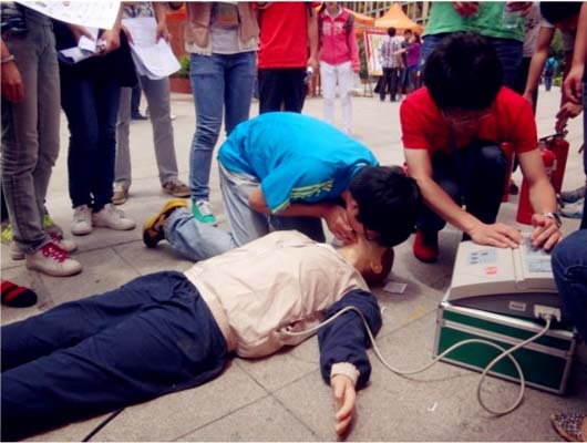 借来了心肺复苏人体模型,通过现场教学演示,向大家讲解怎样正确进行人工呼吸、心脏的按压等应急措施。活动期间,路过的同学们都积极参与互动,认真学习救护技能,现场气氛活跃,很好的达到了宣传的效果。