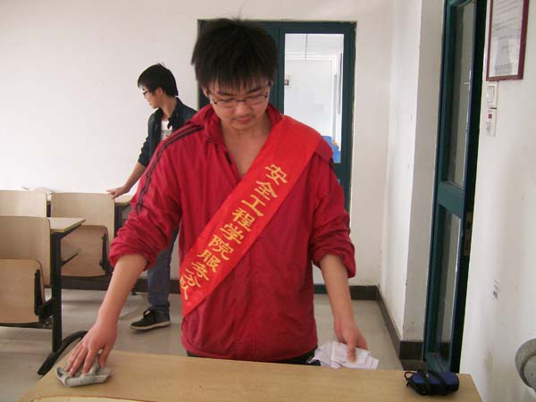 下午4时许,分队A组成员准时到齐。随即,组长钟鑫鹏开始对人员进行安排,做好各项分工,并带领分队成员前往梅苑宿舍楼对各个自习室的各个角落进行彻底的打扫,对课桌椅也进行清洗、统一规范地摆放整齐,并将制作好的宣传单贴于各自习室走道两旁,号召同学们自觉地维护好自习室的卫生,不乱扔垃圾。分队各成员都很积极认真地进行清扫活动,有序并且有效率地展开各项任务,在短时间内就收获了很好的效果,充分体现了当代大学生能吃苦耐劳的优良传统和勇于实践的良好风貌。