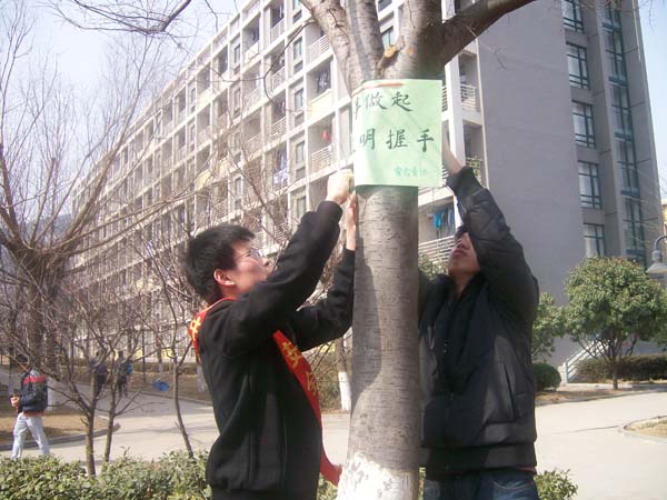 青年志愿者协会由部长黄岩,副部长贾鸿岩带领其部员在三食堂广场做好前期准备工作。本次志愿宣传活动分为两部分,一为“雷锋精神代代传”的雷锋精神宣传单的发放,二为“构建绿色校园”的绿色环保环保标语的张贴。在宣传单的发放过程中,过往的同学纷纷驻足,同学们在接受宣传单后认真观看,若有所思。绿色环保标语主要是提倡保护环境的醒目标语,以提醒同学们提高自身素质,保护校园环境。在宣传活动中,天美传媒