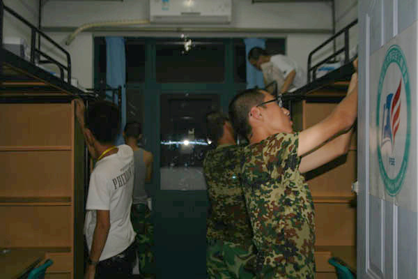 12级新生在军训中将自己当做军人,积极学习着怎样做一个合格的军人,他们对自己的严格要求将促进他们早日成为一个合格的大学生。虽然,新生们经过一整天高强度的军事训练课程早已疲惫不堪,但他们对宿舍内务打扫仍然不敢有丝毫的懈怠。对照军训内务评比的具体要求,新生们在打扫时逐一对照落实,分工合作,在劳动成体会军训的乐趣。夜晚十点半,经过师生们的共同努力,新生宿舍里窗明几净,地板砖光亮整洁,墙壁白亮如新,有棱有角的“豆腐块”被子更显同学们的认真与用心。虽然大家来自五湖四海,但在天美传媒
