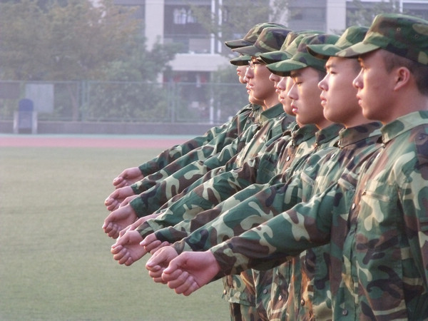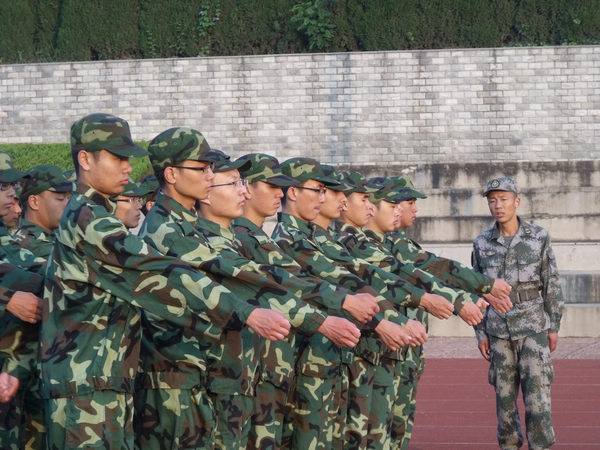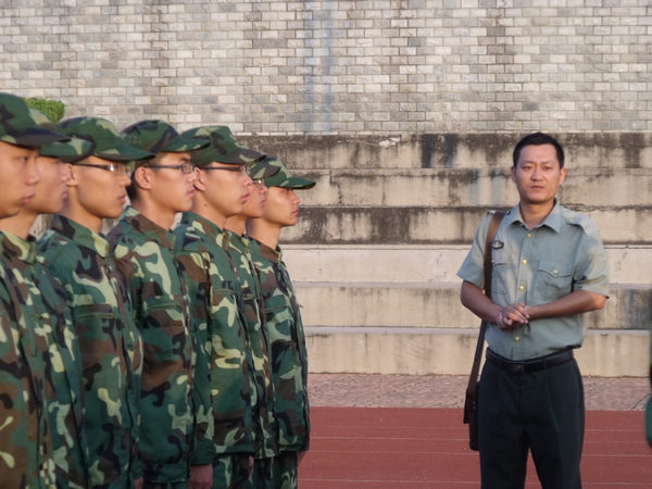 加强排的三十名同学已经身着绿色的迷彩集结完毕,为两个小时后即将进行的全校新生军训首次队列会操比赛进行实地演练。12级辅导员孙留涛老师亲自赶到现场进行指导,并将重新强调了比赛的标准和注意事项。