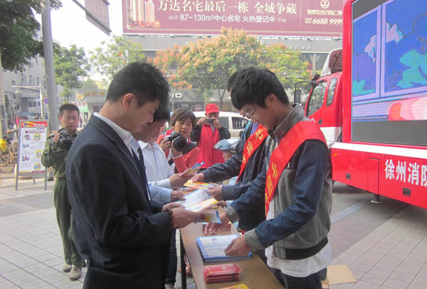 青年志愿者协会部长黄岩,副部长刘碧、贾鸿岩带领安全工程12级的十位新部员一同前往徐州市金地商都举办消防宣传活动。