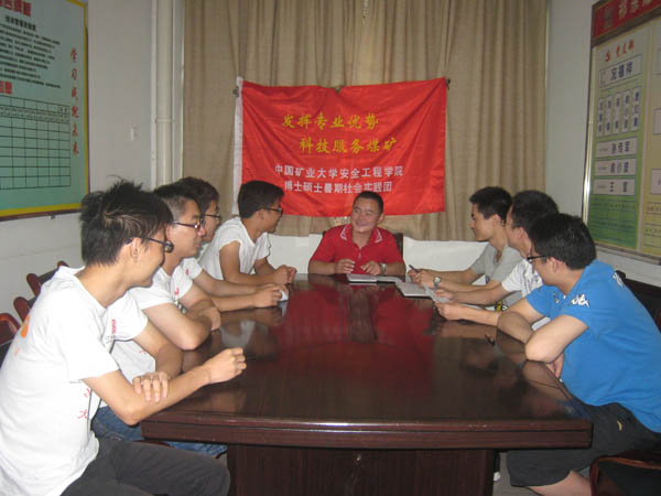 的学习、生活以及科研等方面的情况。通过交流,实践团队也了解到祁东煤矿煤矿的一些先进技术知识,以及一些他们平时在实验室没有涉及的知识。此外,通过与该矿领导座谈,实践团成员也了解到该矿存在煤与瓦斯突出、矿井火灾等灾害,针对这一现状曹凯博士对该矿瓦斯抽放钻场的布置、防灭火等方面给出了相关建议,其建议得到了矿领导的充分肯定。在交流过程中,当团队成员提及进行这次暑期志愿者科技服务的的目的时,矿领导对他们的热情表示衷心的感谢,并立即通知各部门积极配合团队的参观实践活动。上午11时许,此次会面圆满结束。据悉,祁东煤矿位于安徽省宿州市�桥区境内,含煤地层为石炭二叠系。矿井地质储量为335552.3kt,可采储量为294956.6 kt。设计生产能力为每年180万吨。
