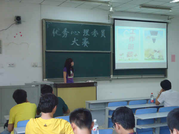 心理自助中心举办的“优秀班级心理委员”评比大赛在教一C101顺利举行。辅导员刘静老师,学生会主席郭良军,团委副书记朱晓宇、李念泽担任本次大赛的评委。