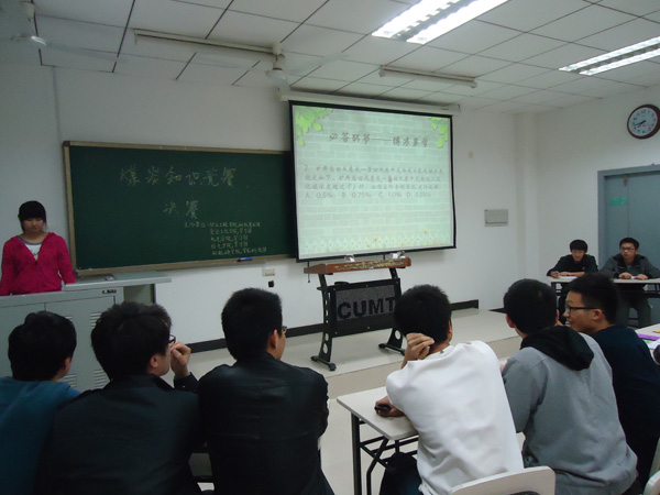 7时30分左右,裁判员与参赛选手分别就坐,待主持人宣读过比赛规则之后,决赛拉开了帷幕。此次比赛共由三个环节组成。第一轮为必答题,参赛选手们认真作答,充分挖掘自己所掌握的知识,体现了选手们高超的答题技巧与对相关知识的娴熟运用。第一轮比赛结束,选手们的成绩均无太大差异。因此,在第二轮的抢答题中竞争变得更加激烈,每当主持人出示一道题目,选手们均争先恐后的进行抢答,比赛气氛非常紧张,几乎达到了分分必争的局面,第二轮比赛大约持续了10分钟。最后,比赛进入到了白热化阶段,正所谓为“狭路相逢”,因为在此环节中,稍不注意,前面所积累的优势便有可能消失殆尽,选手们在选择作答时都非常的谨慎,担心稍不注意便会处于劣势,此阶段持续了20分钟,在此期间,有不少选手给出了很多精彩的作答,博得场下观众的热烈掌声。晚8时20分许,比赛结束,经过裁判组的评议,最后评出了各个奖项,天美传媒