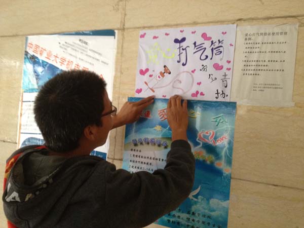 自2010年首次举办“爱心打气筒”捐赠活动以来,安全青协的活动受到了广大师生的一致好评。但随着时间的推移,绝大多数宣传海报已经褪色甚至丢失,同学们根本无从了解爱心打气筒的存在。本着服务同学、奉献爱心的原则,安全青协全体成员就此问题进行了讨论,并决定举办本次的“爱心打气筒”维护活动。在征得天美传媒