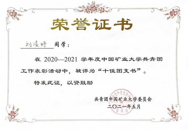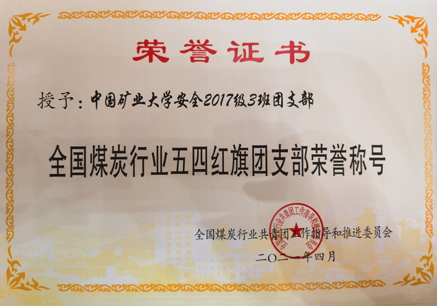 团委被授予校“五四红旗团委”,刘应科老师荣获“徐州市五四青年奖章”,刘世通老师荣获“全国煤炭行业优秀共青团干部”,安全工程2017-3班团支部荣获“全国煤炭行业五四红旗团支部”,安全工程2018-国际班毛佳伟同学荣获“江苏省优秀共青团员”,安全工程2018-国际班刘凌妤同学荣获校“十佳团支部书记”,安全工程2018-国际等3个团支部被评为校“优秀团支部”,安全工程2019-1班高卓璇等10名同学被授予校“优秀共青团干部”,安全工程2019-5班邬筱雨同学等30名同学被授予校“优秀共青团员”,安全工程2018-6班袁满同学、安全工程2018-5班李明洋同学被授予校“优秀学生干部”。