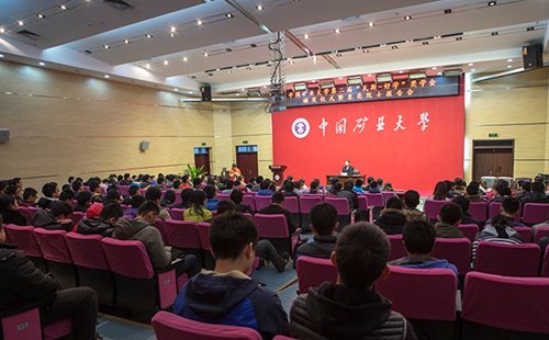 表彰仪式结束后,袁亮院士为同学们作了报告。袁亮院士与同学们分享了自己从煤矿基层做起,敢于吃苦,不断钻研,将个人理想与国家发展紧密结合,最终成为中国工程院院士,并为中国煤炭工业科技进步作出贡献的人生经历。他在报告中特别提到,1982年大学毕业后在淮南矿区多年的一线工作经历,不仅让自己意识到了经典理论和实践存在差距,更认识到了创新思维的重要性。在谈及自己后来的学术研究时,袁亮院士说,正是因为自己不断潜心钻研各地高瓦斯条件矿区情况,将理论与实践相结合,心系国家煤矿安全现状,才能不断攻克技术难关,创新开采方式,提高安全性能,让中国的煤炭开采技术得到世界的认可。