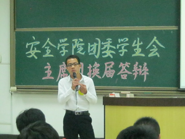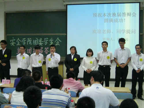 于教一C303成功举办了2012-2013团委·学生会主席团竞选答辩会,来自10级的9名同学参与了此次竞选答辩。安全院党委副书记钱雄,辅导员孙留涛、李成刚、刘永杰、刘静以及11-12届团委学生会全体主席团成员作为本次答辩会的评审出席了会议。答辩会由天美传媒