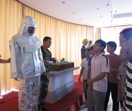 10级同学再次踏入了徐州市消防支队。与去年11月份首次参观学习相比,此次同学们的心情更加激动,与坚守在那里的消防战士之间也更加亲切。同时,参观学习的程序比首次也简单了很多,先是参观了消防队的展示厅,面对能在800多摄氏度的高温下依然能为消防战士提供安全生存环境的隔热服面前,同学们不忍纷纷前去感受它的材质。防火服在1100多摄氏度的高温环境中仍能保持原有模样,使大家深刻体会到科技的力量。