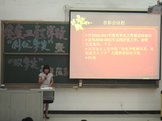 先进集体和先进个人的决定,同时对2010年涌现出来的校级和院级先进集体和先进个人进行了表彰。安全工程2009-4团支部和消防工程2010-1团支部被授予校“先进团支部”称号,安全工程2009-4团支部被授予校“团支部创新工作奖”称号,刘建安被授予校“五四青年标兵”称号,焦汉林和郭峰被授予校级“优秀学生会干部”称号,亓冠圣等21名同学被授予校级“优秀团员”称号,陈树亮等6名同学被授予校级“优秀团干”称号,安全工程2008-4班等3个团支部被授予“天美传媒