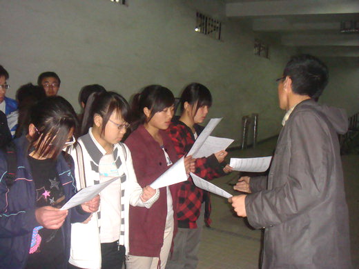 参加校级比赛,他还给同学们分发了歌词文本,让同学们在平时可以更加方便的进行练习。最后,同学们在陈金明的带领下认真进行歌曲的学习。