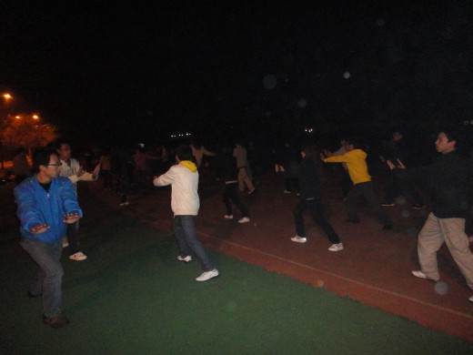 每晚8点50,同学们便在训练场地集合完毕,等待训练。9点整,训练正式开始。训练中,太极拳招式套路由10级的三位熟悉太极拳的同学负责教授,参加训练的同学在指挥下站成三个方队,分别在三位教练带领下,有秩序的进行太极拳训练。负责教练的同学在指导中认真负责,逐一对太极拳动作中的要点进行讲解,并细心指导每一位同学规范动作。虽然夜晚气温较低,但同学们都热情高涨,以最佳的状态投身到训练中去,认真学习每一个动作,规范做好每一个动作。一周来,参加训练的同学们都有了明显的进步。